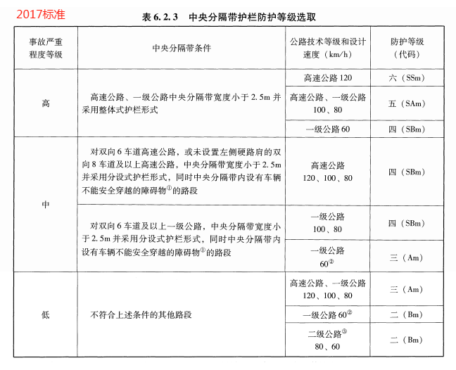 根據中央分隔帶的條件,事故嚴重程度可分為三個等級:高、中、低。中央分隔帶護欄的防護等級應符合6.2.3 的規定。