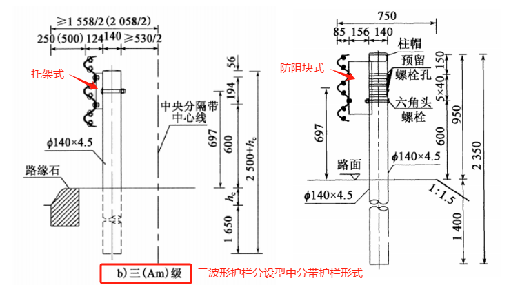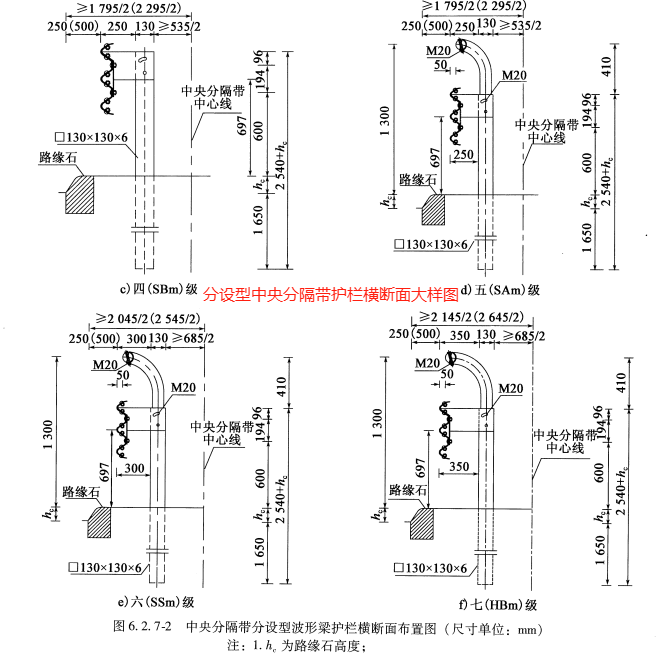 防護等級為二至七(代碼分別為 Bm、 Am、SBm、 SAm、 SSm、 HBm )級的分設型中央分隔帶護欄的構造形式與二至七(代碼分別為 B、A、SB、 SA、SS、HB )級的路側護欄基本相同。