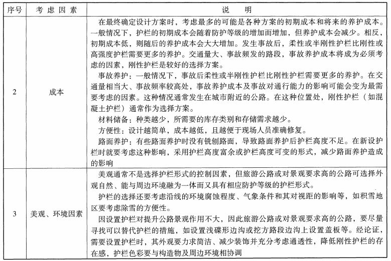 5 應(yīng)考慮護(hù)欄的初期成本、投入使用后的養(yǎng)護(hù)成本,包括常規(guī)養(yǎng)護(hù)、事故養(yǎng)護(hù)、材料儲(chǔ)備和養(yǎng)護(hù)方便性等。宜結(jié)合路面養(yǎng)護(hù)方式采用經(jīng)濟(jì)適宜的形式,并預(yù)先考慮將來的路面養(yǎng)護(hù)需求。